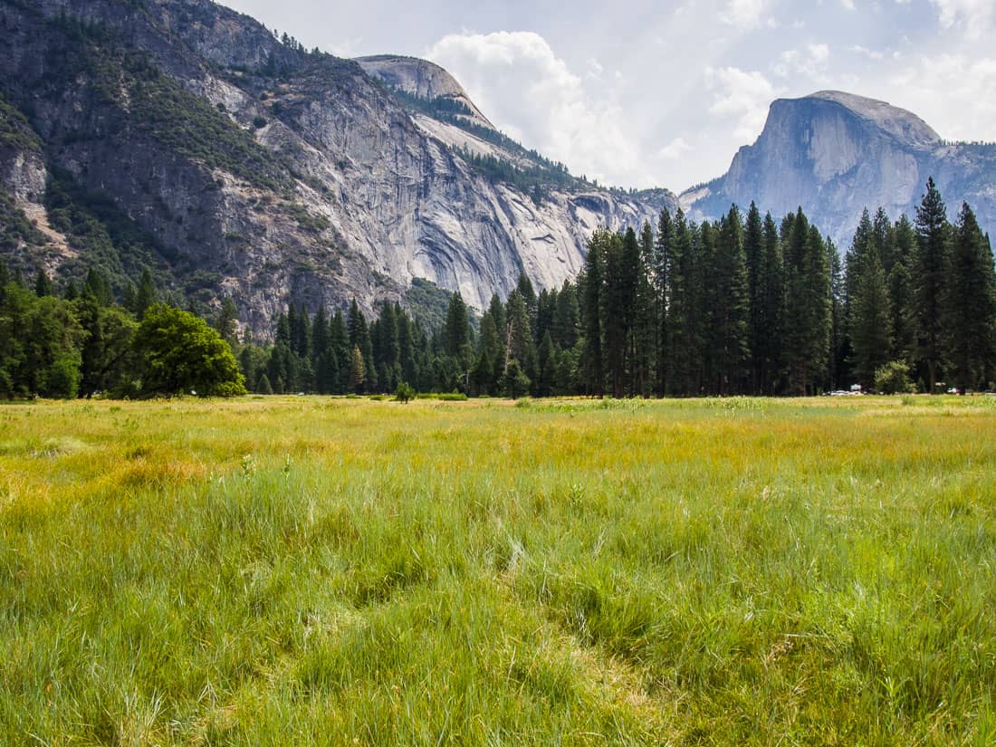 We walked through lush green meadows and along the river, with views of Half Dome and granite cliffs soaring above.
