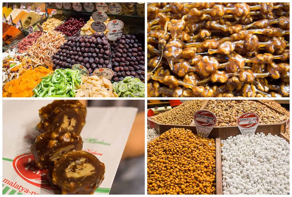 The first shop specialised in the dried fruit and nuts that Turkey does so well. Taci had free rein to fill us with deliciousness and we sampled dried white mulberries, roasted apricot kernels (surprisingly delicious), roasted chickpeas, and some of the interesting things that Turks do with dried fruit—mulberry paste made into a sausage shape and stuffed with walnuts, thin rubbery sheets called fruit leather, and a long string of grape molasses with chunks of walnut inside.
