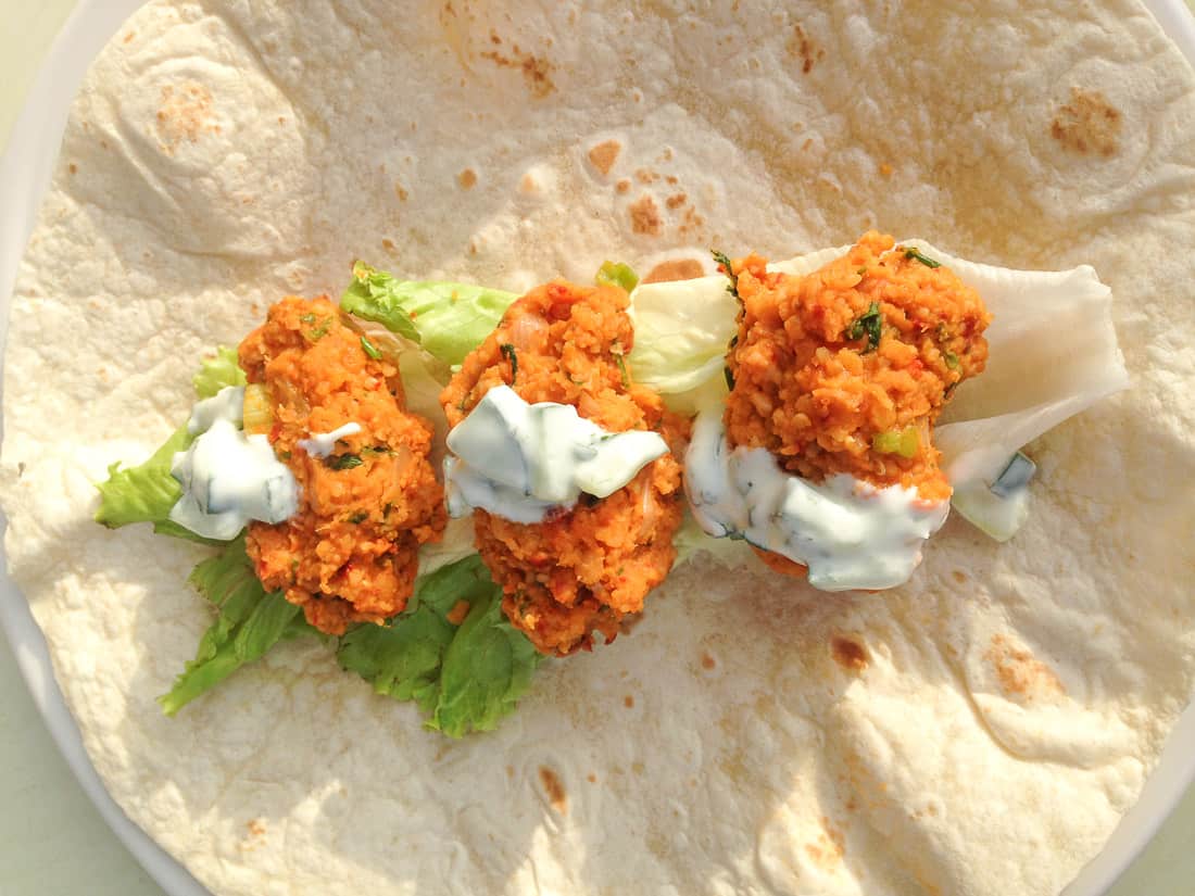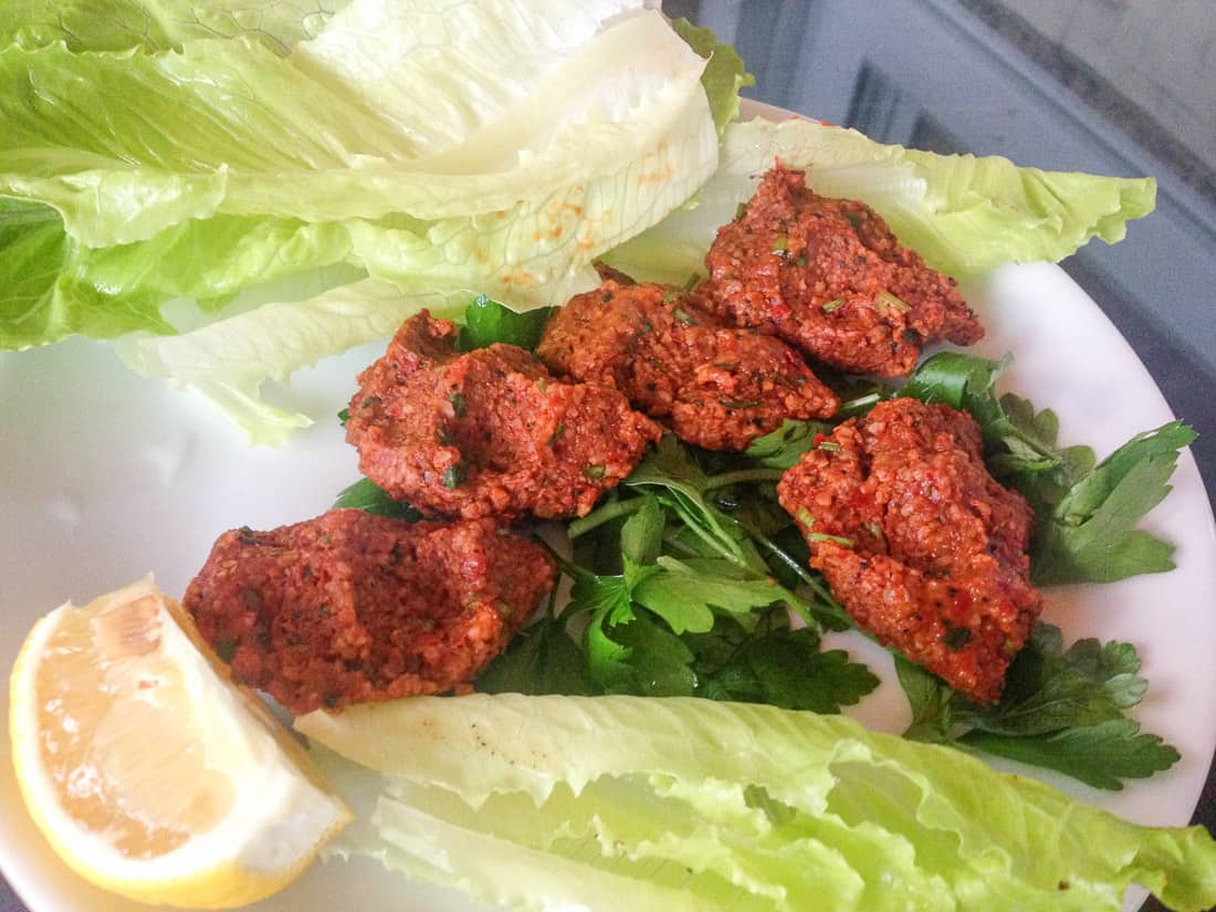 Mercimek Köftesi – Spiced red lentil and bulgur balls, served at room temperature on lettuce (although we liked them in wraps when we made them).