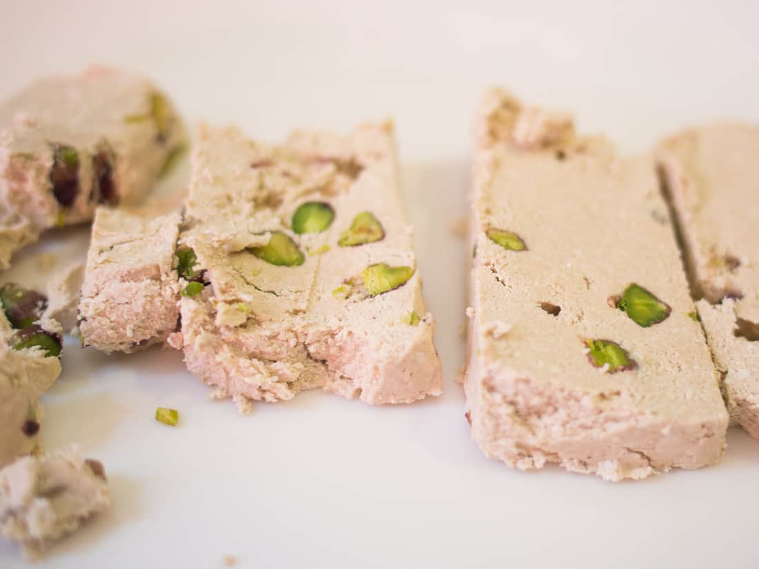Halva is a dense sweet made from tahini (crushed sesame paste) and sugar, sometimes with other ingredients added—I like it with pistachio.