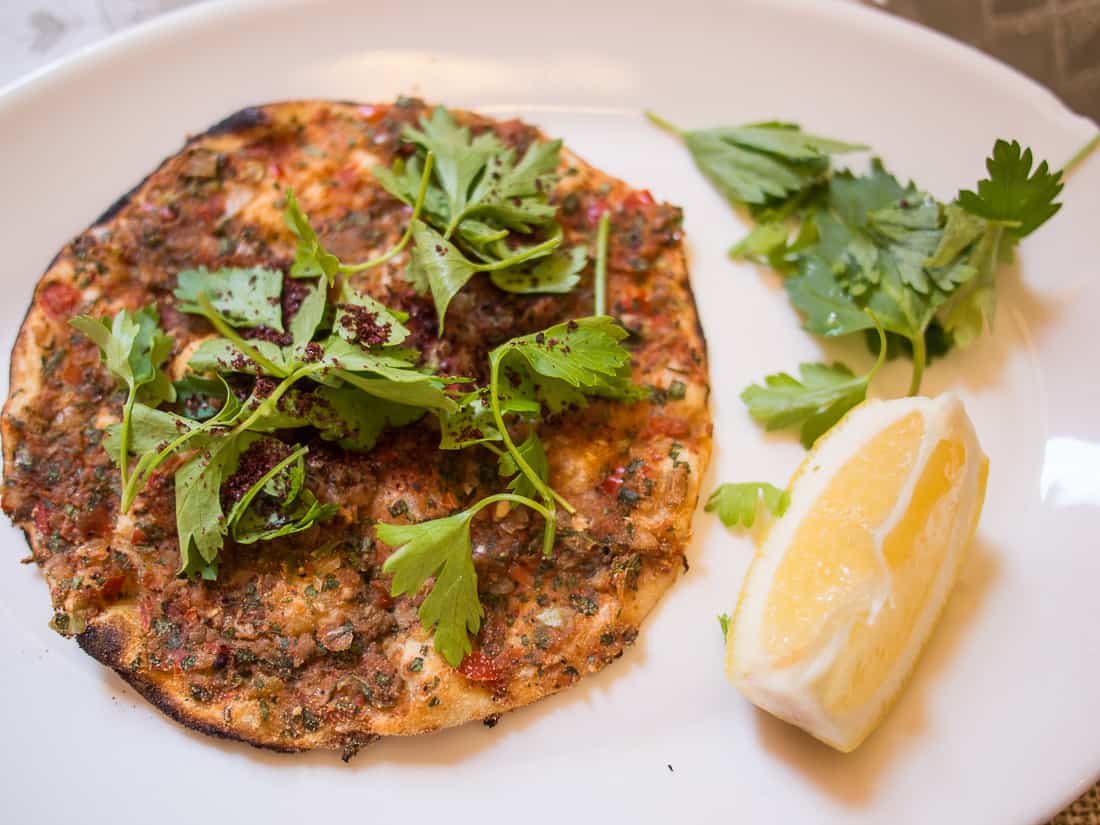 Lahmacun is also called a Turkish pizza but has a much thinner, crispier base and is eaten rolled up. It’s usually made with spicy ground meat, but occasionally we found one with vegetarian toppings.