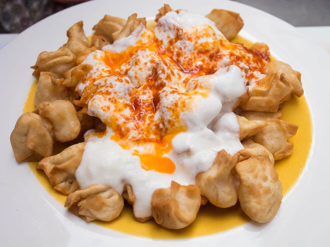 Traditional Anatolian ravioli-like dumplings topped with a yogurt and spicy tomato sauce. The filling is usually meat but you can find versions made with spinach and cheese.
